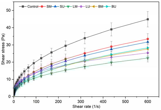 Flow curves of emulsions enriched with phenolic extracts compared to the control. Acronyms: leaves macerated (LM), leaves sonicated (LU), stems macerated (SM), stems sonicated (SU), bracts macerated (BM), and bracts sonicated (BU).