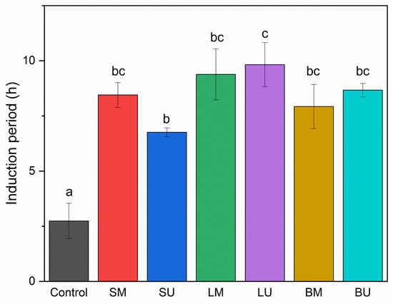 Induction period expressed in hours (h) of the control sample and of the emulsions enriched with phenolic-rich extracts. Acronyms: leaves macerated (LM), leaves sonicated (LU), stems macerated (SM), stems sonicated (SU), bracts macerated (BM), and bracts sonicated (BU). Different letters indicate significant differences among samples (p < 0.05).
