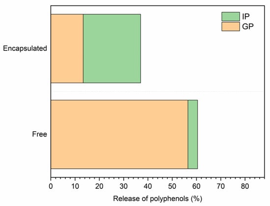 Interestingly, the encapsulation affected the release also in terms of gastric-to-intestinal release ratio: in fact, the release of phenolic compounds upon intestinal digestion was significantly higher (19.49% ± 4.94%) in the encapsulated sample compared to the sample with the free extract (3.99% ± 1.16%). Thus, in the sample containing the free extract, which lacks a protective agent, the release of polyphenols predominantly occurred in the gastric environment. Conversely, in the sample enriched with the encapsulated extract, the encapsulation process provided protection to the phenolic compounds. These results corroborate the findings of González et al. (2020) [39], who demonstrated that encapsulating olive leaf extract with various materials, including maltodextrin, resulted in a higher oleuropein content in the encapsulated sample compared to the free extract after two hours of intestinal digestion. This implied the formation of a polysaccharide-polyphenol complex, which confers protective effects.