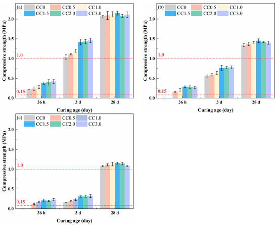 Compressive strength of cemented fine tailings backfill with different CaCl2 contents at the binder-to-tailings ratio of (a) 1:4, (b) 1:6, and (c) 1:8.