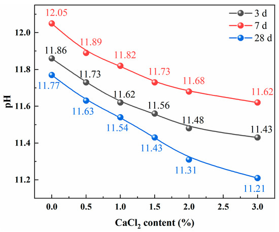 The pH of the pore solution is known to play a crucial role in the dissolution and hydration of raw materials. It has been shown that the hydration reaction of cementitious materials can only proceed when the pH of the pore solution exceeds a certain threshold [22,23]. The evolution of the pH of the pore solution of SWCMs under different CaCl2 contents is shown in Figure 2.