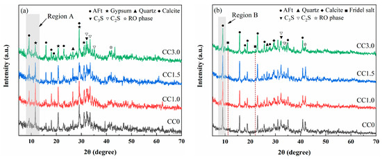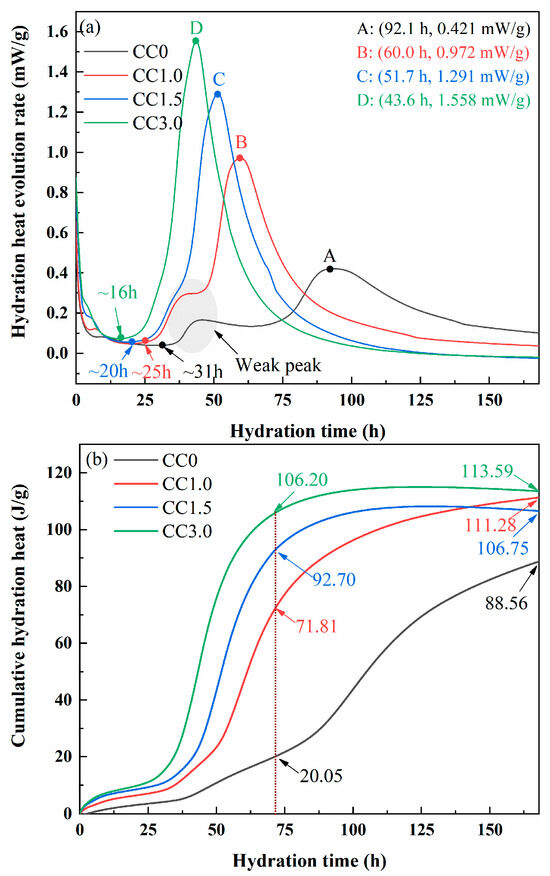 The cumulative heat curves of samples CC0, CC1.0, CC1.5, and CC3.0 are shown in Figure 3b. There are significant differences in the cumulative hydration heat among the hydration samples with different CaCl2 contents during the initial hydration stages. The cumulative hydration heats of samples CC1.0, CC1.5, and CC3.0 are 71.81, 92.70, and 106.20 J/g at 3 days, respectively, with increases of 258.2%, 362.3%, and 429.7% compared to sample CC0. Increasing cumulative hydration heats of samples with CaCl2 indicates that CaCl2 plays a positive role in the reactants’ production, and the higher the CaCl2 content added is, the more hydration products are generated. As the hydration reactions proceeded, the difference in cumulative heat release among the samples decreased. At 7 days, the cumulative hydration heats of samples CC1.0, CC1.5, and CC3.0 are 111.28, 106.75, and 113.59 J/g, respectively, which only increase by 25.7%, 20.5%, and 28.3% compared to sample CC0. This phenomenon is possibly attributed to the hindering effect of the layer of hydration products. As reported in previous studies [28,34], with ongoing hydration reactions, the hydration products will precipitate on the surface of the raw material particles and form a dense hydration layer, which hinders further dissolution and hydration of raw material. At this time, the rate of reactant generation decreases, and the hydration process becomes stable thereafter.