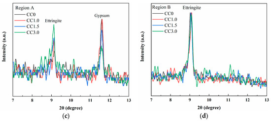As the hydration age extended to 28 days, the diffraction peak of gypsum disappeared in all samples, and the diffraction peak intensity of ettringite significantly increased compared to that in the 3-day samples, suggesting that the gypsum was fully consumed during the production process of ettringite. As can be observed from the magnified image of the strongest diffraction peak of ettringite (Region B), the peak intensity of ettringite is essentially the same in samples with different CaCl2 contents. This may be because the amount of desulfurization gypsum in each sample is consistent, which determines that there is no significant difference in the ettringite production when the desulfurization gypsum is completely consumed at 28 days. In addition, the diffraction peaks 2θ = 11.10° and 22.05° were found in the samples containing CaCl2, which was attributed to the Cl-containing phase. As shown in Equation (7), Cl− can react with Ca2+, Al3+, and OH− to form Friedel salt (3CaO·Al2O3·CaCl2·10HO) [38,39]. The phase has good stability and is conducive to forming a harder skeleton during the hardening process and improving the macroscopic strength of the sample. It was worth noting that the diffraction peak of Friedel salt was not observed in the 3-day sample, mainly because its diffraction peak overlapped with the strong diffraction peaks of gypsum.