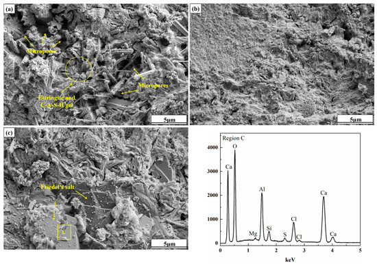 Figure 6 shows SEM images of samples CC0, CC15, and CC3.0 after 28 days. For sample CC0, amorphous C-S-H gel covered the surface of raw material particles to connect them together, and fibrous ettringite interspersed in the gaps between particles, forming a compact matrix. However, some micropores can still be observed in the sample. In comparison, larger quantities of C-S-H gel were generated in sample CC1.5 because of the prompting effect of CaCl2 on the gel formation. Precursor particles were completely wrapped by massive gel reactants, and the number of micropores between particles decreased clearly, as did the size, showing a more compact and homogeneous microstructure. The improvement of the microstructure of the sample has made a substantial contribution to the enhancement of the macroscopic strength. As the CaCl2 content further increased to 3.0%, in addition to amorphous C-S-H gel and fibrous ettringite, several lamellar products were found in sample CC3.0, which were stacked together and embedded in the sample. The EDS analysis indicates that the sheet-like product is rich in elements such as O, Ca, A1, and Cl, in line with the chemical composition of Friedel salts (3CaO·Al2O3·CaCl2·10HO). This phase with a stable structure can act as a skeleton to enhance the sample strength effectively [49].