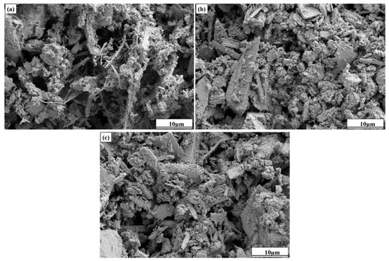 SEM images of cemented fine tailings backfills (a) CC0, (b) CC1.5, and (c) CC3.0 at 28 days.