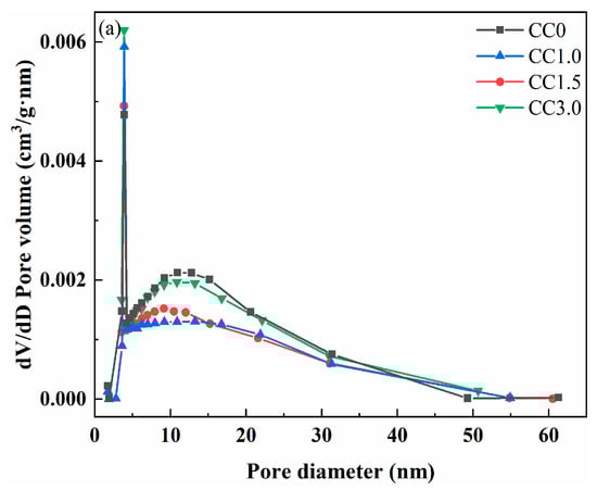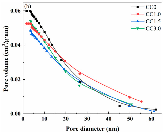 The pore size distribution and pore volume of cemented fine tailings backfills at a binder-to-tailings ratio of 1:8 after curing for 28 days are shown in Figure 8, and the pore structure parameters of these samples are presented in Table 2. Both pore volume and average pore diameter of samples showed a trend of first decreasing and then increasing with continued addition of CaCl2, which was consistent with the development trend of the sample strength. For sample CC0 without CaCl2, the pore volume and average pore diameter were 0.060 cm3/g and 14.160 nm, respectively. By contrast, the pore volume and average pore size of sample CC1.5 decreased to 0.048 cm3/g and 12.499 nm, respectively. In the presence of CaCl2 as an accelerator, larger amounts of hydration products were generated and endowed the cementitious material with better cementing performance for fine tailings, resulting in the improvement of the pore structure. As CaCl2 content further increased to 3.0 wt.%, the pore volume and average pore diameter of sample CC3.0 instead increased to 0.054 cm3/g and 13.246 nm, respectively. This is because the addition of excessive CaCl2 is unfavorable to the formation of reticular C-S-H gel resulting from the reduced pH of the pore solution. As a result, the cementing performance of cementitious materials for fine tailings is somewhat attenuated; in this case, the pore volume and average pore diameter of the sample are increased.