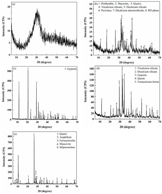 Slag (produced from pig-iron production), steel slag (discharged from the steelmaking process), desulfurization gypsum (a byproduct generated during flue gas desulfurization in coal-fired power plants), and OPC were obtained from Shenfei Construction Material Co., Ltd., Qingdao, China. The 3-day and 28-day strengths of the OPC mortar are 17.41 and 44.35 MPa, respectively. Mine tailings (MTs, discharged from the mineral processing of iron ore) were provided by Fuquan Iron Minel Co., Ltd., Jining, China. The proportion of fine particles (less than 20 μm) of MTs is ~68.72%, and they are classified as fine tailings [5,9]. The chemical compositions of the raw materials were analyzed by an X-ray fluorescence instrument, and the results are shown in Table 3. The XRD patterns of raw materials are presented in Figure 9. Anhydrous calcium chloride (CaCl2, AR, ≥98%) was used as an accelerator.