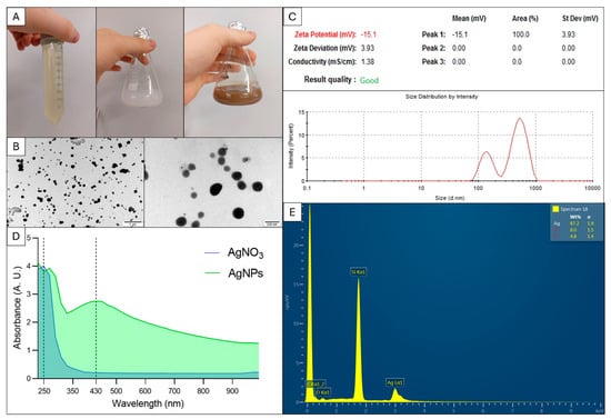 Characterisation of silver nanoparticles (AgNPs) obtained using silver nitrate (AgNO3) and Chlorella vulgaris: (A) Colour change after 3 h of incubation of silver nitrate and algae extract in darkness. (B) Morphology of nanoparticles observed under a transmission electron microscope. Scale bar = 200 nm (right side) and 1 µm (left side). (C) Colloid stability (table) and nanoparticle size (graph) measured with a zetasizer. (D) Ultraviolet−visible spectrum of the AgNPs (green line) and AgNO3 (blue line). Dashed vertical lines were added along the x-axis to indicate the wavelengths corresponding to the peaks of each spectrum, 250 nm for AgNO3 and 430 nm for AgNPs. (E) Chemical composition of AgNPs measured by scanning electron microscopy with a focused ion beam.