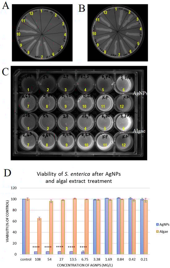 (A) Minimum bactericidal concentrations of silver nanoparticles (AgNPs) after 24 h incubation. (B) Minimum bactericidal concentrations of algal extract after 24 h incubation. (C) Minimum inhibitory concentration and turbidity for different concentrations of AgNPs and algal extract after 24 h incubation. (D) PrestoBlue test results after 24 h of incubation of S. enterica with AgNPs and algal extract. **** = significant difference (p ≤ 0.0001). 1–10: Nanoparticles/algae extract concentrations; 1: 108 mg/L, 2: 54 mg/L, 3: 27 mg/L, 4: 13.5 mg/L, 5: 6.75 mg/L, 6: 3.38 mg/L, 7: 1.69 mg/L, 8: 0.84 mg/L, 9: 0.42 mg/L, 10: 0.21 mg/L, 11: positive control, 12: negative control.