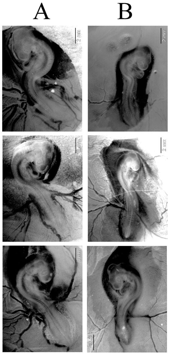 On day 16, the 10 eggs were opened and the embryos decapitated. The number of dead or malformed embryos was recorded. The weight of the embryos and their organs were measured.