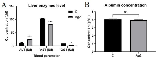 (A) Concentration of alanine aminotransferase (ALT), aspartate aminotransferase (AST), and gamma-glutamyltransferase (GGT) in the plasma of 16 d old chicken embryos from the control group (C) compared to the group injected with silver nanoparticles (AgNPs) at a concentration of 2 mg/L, measured using Fuji Dri-Chem NX500 analyser. (B) Albumin concentration in the plasma of 16 d old chicken embryos from the control group (C) and the group injected with AgNPs at a concentration of 2 mg/L. * = significantly different (p ≤ 0.05); *** = significantly different (p ≤ 0.001); ns = not significantly different (p > 0.05).