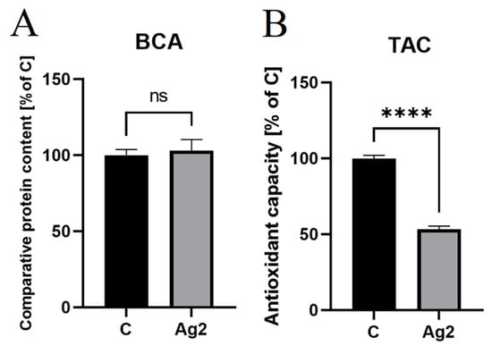 (A) Protein content in the plasma of 16 d old chicken embryos from the control group (C) compared to the group injected with silver nanoparticles (AgNPs) at a concentration of 2 mg/L, measured by the bicinchoninic acid (BCA) method. (B) Total antioxidant capacity (TAC) in the plasma of 16 d old chicken embryos from the control group and the group injected with AgNPs at a concentration of 2 mg/L. **** = significantly different (p ≤ 0.0001); ns = not significantly different (p > 0.05).