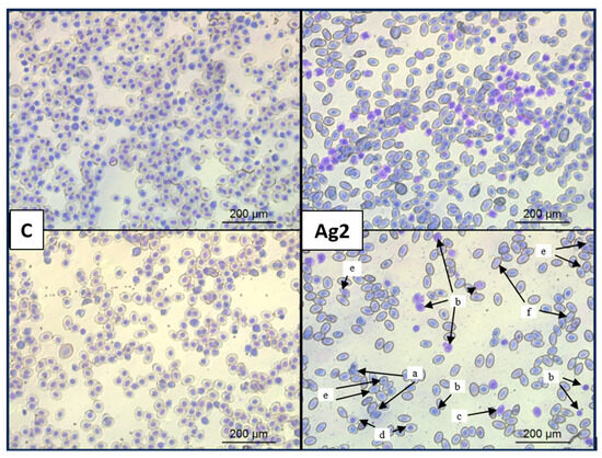 Blood smears under light inverted microscopy from the control group (C) and the silver nanoparticle (AgNP)-treated group after staining with May–Grünwald–Giemsa. Arrows indicate examples of morphological changes in erythrocytes: (a) deformation; (b) polychromatophilic/immature erythrocyte; (c) polychromatophilic poikilocyte; (d) erythrocyte swelling; (e) mitotic erythrocyte; (f) loss of distinct nuclear structures in the erythrocyte. Scale bar = 200 µm.