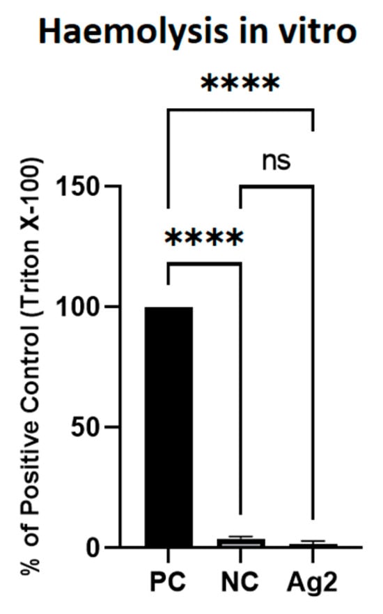 Haemolysis of erythrocytes after 1 h of exposure to Triton X-100 (positive control—PC), phosphate-buffered saline (negative control—NC), and silver nanoparticles (AgNPs) at a concentration of 2 mg/L. **** = significantly different (p ≤ 0.0001); ns = not significantly different (p > 0.05).