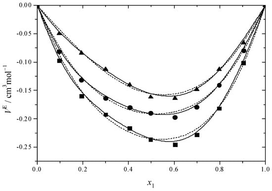Figure 1 and Figure 2 illustrate the results for the excess molar volume, which are presented additionally in Table S4. The values of VE are negative for the systems under study.