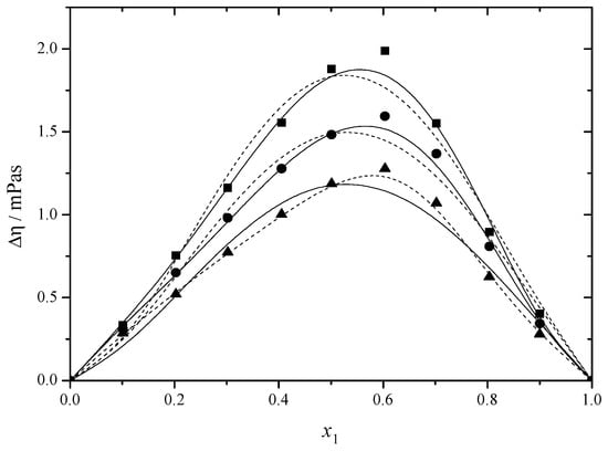 The viscosity deviation of the mixtures represents, along with the excess volume, an important tool to describe the interactions present in the solutions. A negative value of the viscosity deviation of a binary solution shows that the real viscosity of the solution is lower than that of the ideal solution, while a positive viscosity deviation indicates that the viscosity of the real solution is higher than that of the ideal solution. When the interactions between the solution molecules are weak or intermolecular repulsion forces are present, the viscosity of the solution is lower. When strong intermolecular interactions, such as hydrogen bonds, van der Waals forces, or other intermolecular forces, are present, the viscosity of the mixture is higher. The Δη values for the binary systems studied in this work are positive. The values of Δη, whether positive or negative, rely on the equilibrium between two kinds of molecular interactions: self-association and cross-association. Self-association describes the affinity between similar molecules, which generally reduces the viscosity [22]. Cross-association denotes the attraction between various molecules, like hydrogen bonding and dipole–dipole interactions, which can enhance viscosity [66,67].