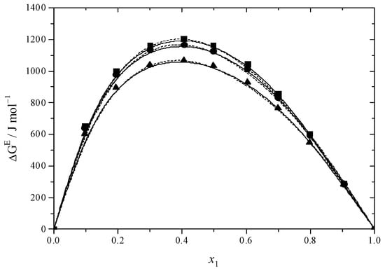 The parameters and standard deviation σ (Equation (7)) for VE, Δη, and ΔG#E determined using the Redlich–Kister and Hwang equations are presented in Table S5. The data shown indicate that the Redlich–Kister equation provides the best correlation for all excess properties in both systems.