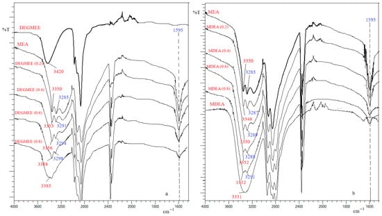 IR spectrometry is an instrumental analysis method that allows the identification of the structure of organic compounds as well as the study of interactions between molecules of pure compounds and binary solutions of components. In this regard, an important place is occupied by the study of hydrogen bonds. The FT-IR spectra of the pure components (MEA, MDEA, and DEGMEE) and solutions with different concentrations were recorded in this work and are illustrated in Figure 7. The stretching vibration of the OH group shows two characteristic values, 3650–3590 cm−1 (sharp band) for free OH and 3550–3200 cm−1 (broad band) for OH involved in hydrogen bonds [17].