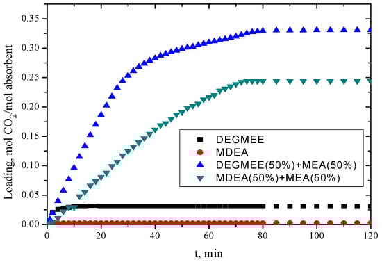 Loading CO2 of pure DEGMEE, pure MDEA, DEGMEE (50%) + MEA (50%), and MDEA (50%) + MEA (50%) binary systems.
