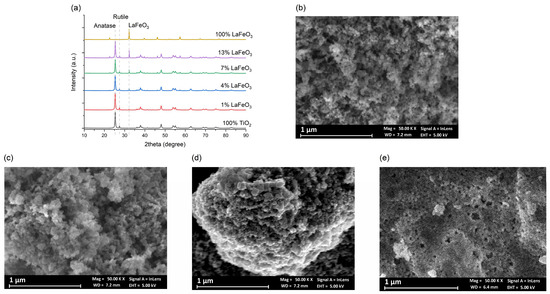 (a) XRD patterns of B-D-E nanocomposites and the reference compounds TiO2 and LaFeO3; (b) SEM image of C; (c) SEM image of D; (d) SEM image of E; (e) SEM image of LaFeO3.
