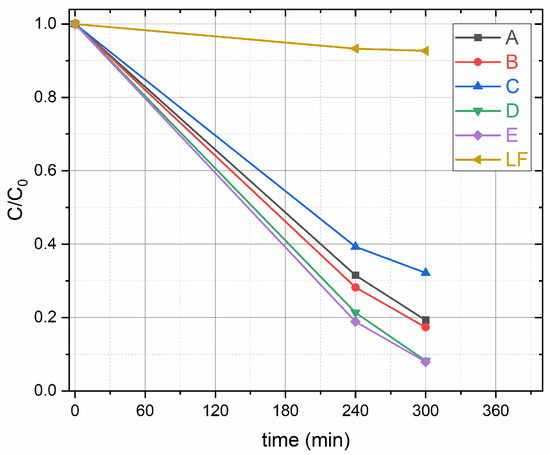 Photocatalytic degradation of BA in the presence of samples A (TiO2), B (1.3 wt%-LaFeO3/TiO2), C (3.9 wt%-LaFeO3/TiO2), D (6.2 wt%-LaFeO3/TiO2), E (12.2 wt%-LaFeO3/TiO2) and LF (LaFeO3) from HPLC analysis. Experimental conditions: 0.120 g L−1 catalyst loading, [BA] = 1 × 10−4 M, λ = 380–800 nm light.
