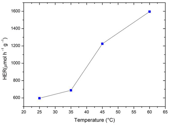 Photocatalytic hydrogen evolution rate (HER) at varying temperature of the system. Methanol was used as a model scavenger. Experimental conditions: [Methanol] = 2.5 M; 0.50 g L−1 catalyst loading (Sample C); V = 0.3 L; natural pH of the solution.