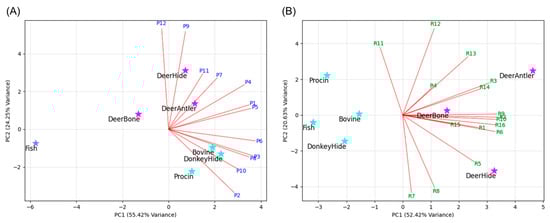 Principal component analysis (PCA) of sika deer gelatin and commercially available gelatins with peptides (A) P1–P12 and (B) R1–R16.