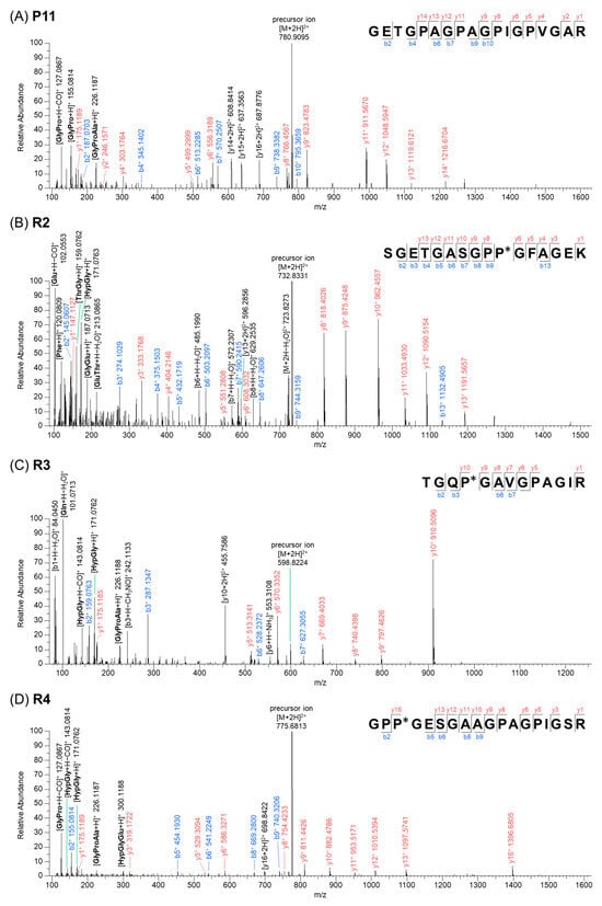 Product ion spectrum of marker peptides obtained from ESI-MS/MS (P* and Hyp indicate hydroxyproline). (A) Peptide P11, (B) peptide R2, (C) peptide R3, and (D) peptide R4.
