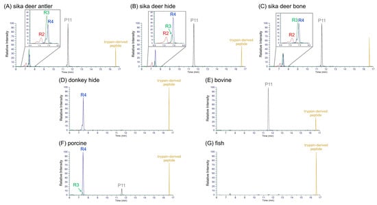 Extracted ion chromatograms (XICs) of marker peptides in sika deer gelatin and commercially available gelatins. (A) Sika deer antler, (B) sika deer hide, (C) sika deer bone, (D) donkey hide, (E) bovine, (F) porcine, and (G) fish.