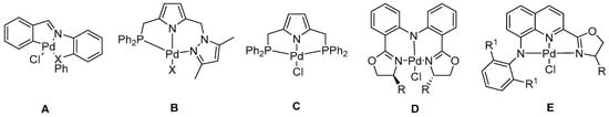 Representative pincer palladium(II) catalysts for norbornene polymerization reported in the literature: (A) CNX pincer Pd(II) catalysts, (B) PNN pincer Pd(II) catalysts, (C) PNP pincer Pd(II) catalyst, (D,E) NNN pincer Pd(II) catalysts.