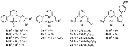In recent decades, we have been working on the synthesis and applications of tridentate-coordinated pincer metal complexes [36,37,38,39,40,41,42,43,44,45]. For instance, chiral oxazoline-containing CNN Pd pincer 1 was found to be a stereoselective catalyst for the asymmetric allylation of isatins with allyltributyltin (up to 86% ee) and the Suzuki–Miyaura reaction (up to 68% ee) [36]. While the related achiral CNN pincer Pd complex 2 with N-substituted-2-aminomethyl-6-phenylpyridines CNN pincer Pd(II) complexes (Chart 2, 2) exhibited good activities in the allylation of aldehydes as well as three-component allylation of aldehydes, arylamines, and allyltributyltin [37]. The achiral phosphinite–imine complexes were effective catalysts for the Suzuki–Miyaura and copper-free Sonogashira cross-coupling reactions [38]. In addition, it was proved that the chiral PCN pincer Pd complexes with aryl-based phosphinite–imidazoline ligand 4 were also applied to asymmetric Suzuki–Miyaura reaction, albeit with rather modest enantioselectivities (up to 32% ee) [39]. All of these Pd pincer complexes could be conveniently and readily synthesized, generally in 2–3 steps. However, the potential of these complexes in olefin polymerization has not been explored. In continuation of our research interest in pincer chemistry [36,37,38,39,40,41,42,43,44,45], herein, we synthesized a series of known and new pincer Pd(II) complexes including achiral and chiral CNN and PCN Pd(II) pincers 1–4 (Chart 2) and investigated their catalytic properties in NB polymerization in the presence of EtAlCl2, Et2AlCl, or MAO.