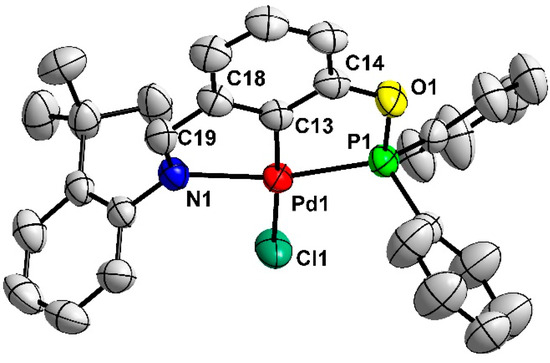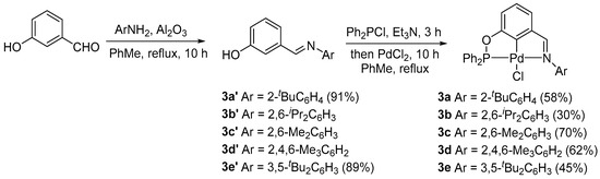 The new complexes with aryl-based phosphinite–imine ligands 3a–e were easily prepared when starting from commercially available 3-hydroxybenzaldehyde as they could be made in only two steps according to the method previously reported by us [38]. Firstly, 3-hydroxybenzaldehyde reacted separately with various substituted aromatic primary amines to afford the corresponding imines 3a′–e′ (Scheme 1). Subsequently, a one-pot phosphorylation/palladation reaction of PCN pincer preligands 3a′–e′ was carried out via treatment with Ph2PCl in the presence of the Et3N base in refluxing toluene for phosphorylation followed by in situ palladation with PdCl2, affording the complexes 3a–e with 30–70% yields. The new complexes 3a–e were fully characterized through 1H NMR, 13C{1H} NMR, and 31P{1H} NMR spectroscopies, as well as elemental analyses, which were consistent with the expected structures of these complexes. In addition, the molecular structure of complex 3a was determined via X-ray single-crystal diffraction analysis, which unambiguously confirmed the PCN tridentate coordination mode in the complex. The molecule is shown in Figure 1. The Pd(II) center adopts a typical distorted-square-planar geometry, and the bond lengths and angles around the Pd center are comparable to those in the homologous PCN Pd pincers [38].