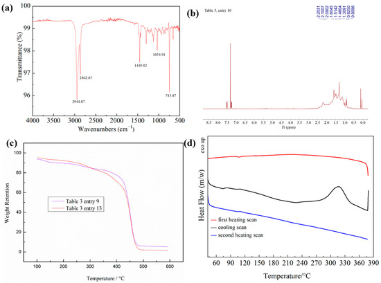 The synthesized polymers were characterized to determine their microstructure. First, the FT-IR spectrum of PNB revealed that there are no traces of (-C=C-) double bonds at 1600–1700 cm−1 (Figure 2a), and their 1H NMR spectra showed no peak around 5.0–6.0 ppm (Figure 2b), suggesting the presence of vinyl-type polynorbornene [19,48]. According to the thermogravimetric analysis (TGA) thermogram, the thermal stability of the polymer was as high as 400 °C (Figure 2c), and the polymer did not undergo a glass transition at 380 °C according to the analysis of the DSC diagram (Figure 2d). These results showed that the polymer had excellent thermal stability.
