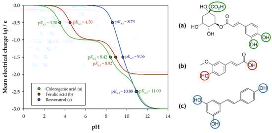 Calculated mean electrical charges with pH and chemical structure of chlorogenic acid (CA, (a)), ferulic acid (FA, (b)), and resveratrol (RV, (c)).