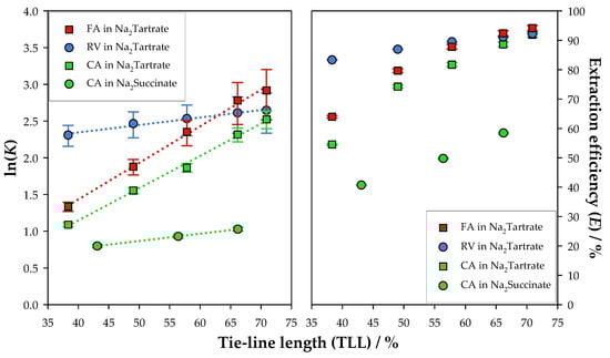 Between CA and RV, although RV presented higher values for the performance indicators across the studied tie-line lengths, there seemed to be a tendency for the partition coefficients of CA to increase for longer tie-line lengths. Even so, as it is not possible to extrapolate data, RV was better extracted through the ATPS based on Na2Tartrate.