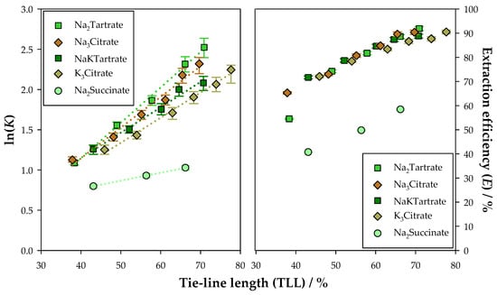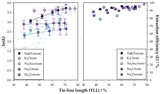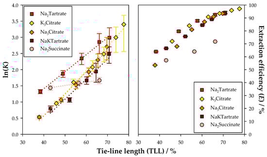 The mass losses in quantification () were consistently lower than 5%, which validates UV-Vis absorbance as a proper quantification method. Moreover, the biomolecule concentration was always higher in the top phase, which is indicative of a successful extraction. Nevertheless, the evaluation of the extraction must be conducted through the analysis of the performance indicators, partition coefficient (), and extraction efficiency (). In order to better understand and compare these performance indicators, a graphical representation of their relationship with tie-line length is presented in Figure 2.