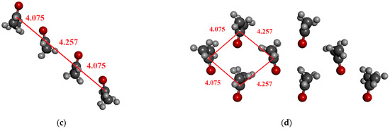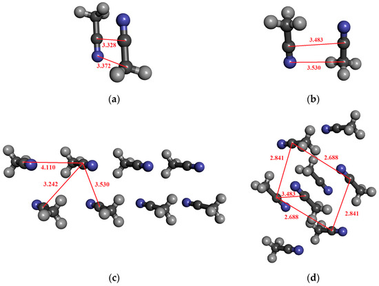 For acetonitrile, dimeric, tetrameric, and octameric structures were investigated in which the molecules are arranged in an anti-dipole arrangement. Table 5 contains the results. The coordinates derived from the crystal structure can be found in the Supporting Information. The α-form of acetonitrile crystal forms a perfectly ordered monoclinic crystal structure, in which a chain of head-to-tail ACN molecules is observed, running alongside four other antiparallel chains [89]. It is important to highlight that the C–N distance in the crystal is significantly longer (0.2–0.3 Å) than for the optimized dimer (cf. Figure 4a,b). Here, we consider both cases in the calculations.