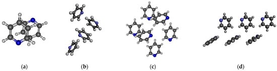 Investigated structures of pyridine: (a) anti-dipole orientation of optimized dimer pyridine structure; (b) pyridine cluster consisting of four molecules; (c,d) two different arrangements of pyridine cluster consisting of six molecules.