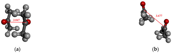 In the optimized dimer geometry, the C…O distance is ca. 3.05 Å while the CH…O distance is 2.65 Å. This structure corresponds to an anti-dipole dimer configuration (Figure 8a). In the not-optimized case, the C-O distance is significantly larger (Figure 8b). For the tetramer cluster (Figure 8c), originating from the crystal structure, a head-to-tail structure is obtained in which the axes of the two molecules are shifted in a parallel way. In this latter case, the characteristic C…O distances are 3.2 Å and 3.8 Å, to which the structure-defining electrostatic interaction can be assigned. Additionally, the CH…O distance for this structure is around 2.75 Å and 2.88 Å. Even for a structure of eight acetone molecules (Figure 8d), these distances can be attributed to the most important electrostatic or H-bonding interactions.