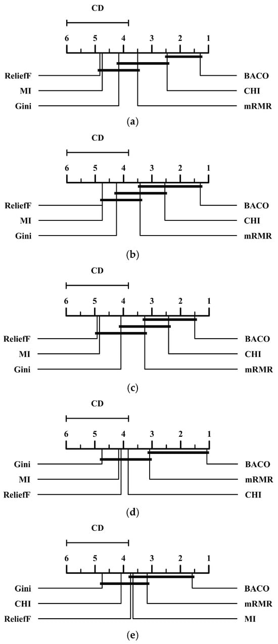 To confirm the superiority of the proposed BACO feature selection approach, we also conducted the Nemenyi test [32,33] for the results in Table 2, Table 3, Table 4, Table 5 and Table 6. Figure 1 presents the critical difference (CD) diagrams of several feature selection methods at a standard level of significance α = 0.05 in terms of five different performance metrics. Specifically, if the difference between the average rankings belonging to two different methods is lower than a CD unit, then they would be regarded as having no significant difference in statistics. From Figure 1, we observe that BACO significantly outperforms several other methods, except for CHI and mRMR, in terms of both the G-mean and MCC metrics. In both the F-measure and AUC metrics, BACO shows no significant difference with only one method, CHI and mRMR, respectively. Meanwhile, for the PR-AUC metric, BACO only significantly outperforms two other feature selection methods, namely, Gini and CHI. To summarize, although the superiority of BACO is not significant enough in comparison with a few methods, it can still be regarded as the best option among these compared approaches as it yields the lowest average ranking on each performance metric.