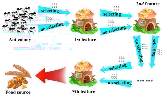 In this study, we design a binary ant colony optimization (BACO) algorithm to conduct feature selection tasks. The mechanism procedure of BACO is described in Figure 2. It can be observed that, between the nest and the food source, there are N sequentially arranged sites, with each one corresponding to a feature. From one feature to the next, there are two alternative pathways: one denotes that the next feature should be extracted into the feature group, and the other one denotes the next feature should be abandoned. When an ant travels from one feature to the next feature, the probability of selecting the pathway j (j = 1 or 2) can be calculated as follows: