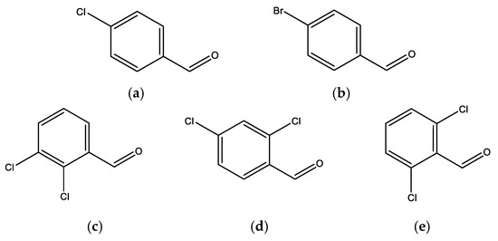 Structural formulae of the halogenated benzaldehydes studied in this work: (a) 4-Chlorobenzaldehyde, (b) 4-Bromobenzaldehyde, (c) 2,3-Dichlorobenzaldehyde, (d) 2,4-Dichlorobenzaldehyde and (e) 2,6-Dichlorobenzaldehyde.