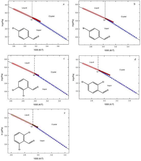 Phase diagrams in the vicinity of the triple points for the five compounds studied: ○, vaporization; ●, vaporization (supercooled liquid); Δ, sublimation. TP: Triple point coordinates. (a) 4-Chlorobenzaldehyde: Ttp = 319.43 K; ptp = 1.23 × 102 Pa; (b) 4-Bromobenzaldehyde: Ttp = 330.02 K; ptp = 99.1 Pa; (c) 2,3-Dichlorobenzaldehyde: Ttp = 334.82 K; ptp = 87.6 Pa; (d) 2,4-Dichlorobenzaldehyde: Ttp = 343.90 K; ptp = 2.01 × 102 Pa; (e) 2,6-Dichlorobenzaldehyde: Ttp = 342.99 K; ptp = 85.7 Pa.