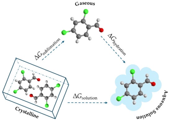 The equilibrium solubility of the five halogenated benzaldehydes were determined in water by saturation shake flask method, at atmospheric pressure, and at a temperature of 25 °C. The concentration was measured by absorbances at 260 nm for 4-chlorobenzaldehyde, 263 nm for 4-bromobenzaldehyde and 2,4-dichlorobenzaldehyde, 297 nm for 2,6-dichlorobenzaldehyde, and 306 nm for 2,3-dichlorobenzaldehyde, using a Cary-60 UV–vis (Agilent) spectrophotometer. X-ray diffraction (XRD) and differential scanning calorimetry of residual solids were used to identify the eventual phase transformations. The purified samples of each compound studied were used for all experimental determinations, including the solubility measurements. After reaching the equilibrium, the residual solid was dried and analyzed using both DSC and XRD. The melting properties obtained from DSC were compared with those of the original purified sample, following the same procedure for the XRD analysis. For all compounds, the melting properties and XRD patterns were similar, leading us to conclude that no polymorphs were present. As an example, the supporting information includes two thermograms and two XRD patterns for 2,4-dichlorobenzaldehyde (Figures S1 and S2). The pH of the saturated solutions was measured and is reported in Table S2. Three independent shake-flask experiments were conducted for each reported result listed in Table 6. The standard deviation of the mean result was also calculated. Considering the thermodynamic cycle schematically represented in Figure 3 [28,29] and Equation (4), the sublimation Gibbs energy and solubility results obtained in this study for the five substituted benzaldehydes were utilized to calculate the standard Gibbs energies of hydration. Equation (4) was derived from Equation (5), which is widely applicable to the solubility of solids [28,29].