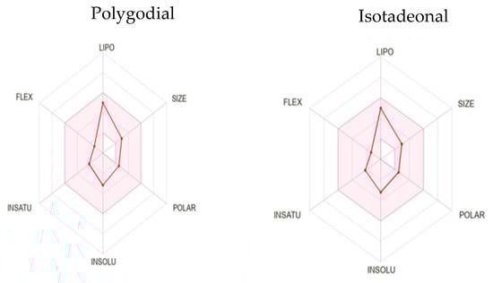 These predictions offer valuable insights into their ADMET (Absorption, Distribution, Metabolism, Excretion, and Toxicity) properties and overall druggability. Both compounds comply with Lipinski’s Rule of Five without any violations, suggesting favorable oral bioavailability. This is indicated by their molecular weight (MW) < 500 Da, number of rotatable bonds (RB) < 2, hydrogen bond acceptors (HBA) < 2, hydrogen bond donors (HBD) = 0, and partition coefficient (log P) < 3, supporting their promising physicochemical and pharmacokinetic properties for drug development [26].