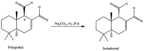 Polygodial was isolated from a concentrated fraction obtained by extracting Drimys winteri bark with ethyl acetate (EtOAc). The concentrate was purified by column chromatography (CC) on silica with hexane/EtOAc (4:1 v/v) as the eluent, monitored by thin layer chromatography (TLC) and visualized by UV (254 nm), and stained with KMnO4. A total of 345 mg of polygodial was purified, and then 100 mg was used to obtain isotadeonal by epimerization in basic media with sodium carbonate, producing 60 mg of isotadeonal after CC. Isotadeonal showed a retention factor (Rf) of 0.68, compared to polygodial, which had an Rf of 0.54 in hexane/EtOAc (4:1 v/v) (Scheme 1).