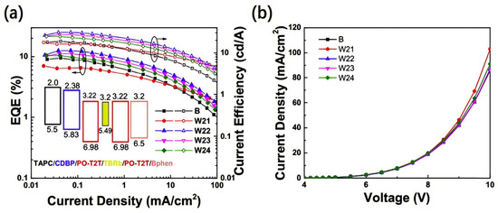(a) EQE and CE−current density characteristics of device B, W21, W22, W23, and W24. Inset: the schematic energy level diagram of the devices. (b) Current density−voltage characteristics of the devices [63].