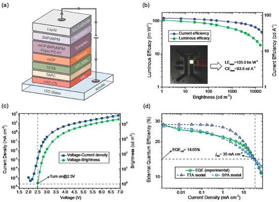(a) Device structure of the white OLED. (b) Luminous efficacy–current efficiency–brightness characteristics. The inset is the image of the corresponding white OLED. (c) Current density–voltage−brightness characteristics. (d) External quantum efficiency−current density curve. The green solid line is the measured data, while the two blue dashed lines are the EQE fitted upon considering TTA and SPA models [90].