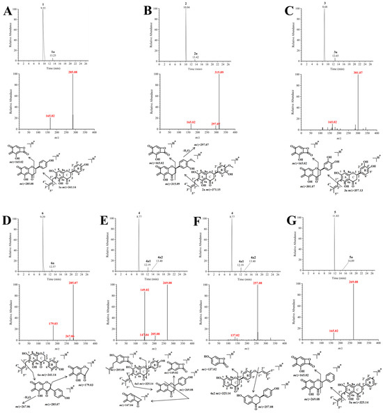 The prenylated products analyzed by UPLC-MS/MS at positive mode. (A) Total ion flow diagram of naringenin (1) and prenylated naringenin (1a), MS2 fragmentation of the prenylated product and the proposed fragmentation pathway of prenylated products. (B) Total ion flow diagram of hesperitin (2) and prenylated hesperitin (2a), MS2 fragmentation of the prenylated product and the proposed fragmentation pathway of prenylated products. (C) Total ion flow diagram of eriodictyol (3) and prenylated eriodictyol (3a), MS2 fragmentation of the prenylated produc and the proposed fragmentation pathway of prenylated products. (D) Total ion flow diagram of dihydrogenistein (6) and prenylated dihydrogenistein (6a), MS2 fragmentation of the prenylated product and the proposed fragmentation pathway of prenylated products. (E) Total ion flow diagram of liquiritigenin (4) and prenylated liquiritigenin (4a1), MS2 fragmentation of the prenylated product and the proposed fragmentation pathway of prenylated products. (F) Total ion flow diagram of liquiritigenin (4) and prenylated liquiritigenin (4a2), MS2 fragmentation of the prenylated product, and the proposed fragmentation pathway of prenylated products, respectively. (G) Total ion flow diagram of rac-pinocembrin (5) and prenylated rac-pinocembrin (5a), MS2 fragmentation of the prenylated product, and the proposed fragmentation pathway of prenylated products, respectively.