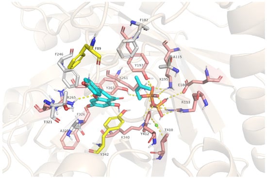 To gain insight into the active center of FgPT1, homology modeling was performed by the high sequence identity (89%) with DMATS1 from Fusarium fujikuroi. Using the DMATS1 crystal structure bound to DMSPP/tyrosine (PDB: 8DAY) [37]. The result generated an FgPT1 model revealing a conserved β-barrel core comprising 10 antiparallel β-strands enveloped by 11 α-helices (Figure 5). This configuration forms the signature ABBA fold of soluble aromatic PTs, with the central hydrophobic cavity essential for substrate docking [31,38,39,40]. Molecular docking results revealed that the hydrophobic environment created by residues F246, Y263, T321, and A325 facilitated the localization of naringenin. Studies have revealed that π-π stacking interactions and hydrogen bonds between amino acid residues and the substrate significantly enhance substrate stabilization [41]. The B-ring and A-ring of naringenin form π-π stacking interactions with residues F89 and Y342, respectively. Furthermore, hydrogen bonds between the O-1 atom of the C-ring and R265, as well as between the 7-hydroxyl group of the A-ring and F326, further stabilize the binding conformation of naringenin within the enzyme’s active site. And Ba2+ formed hydrogen bonds with T410 and Y412. Metal ions usually play an important role in stabilizing the binding of phosphate groups and in promoting the formation and cyclization of key intermediate carbon cations [42]. For the prenyl donor DMAPP, its alkyl chain was anchored by hydrophobic residues A115, F182, and Y197, while the pyrophosphate moiety interacts with R113, E186, K195, Y197, K261, Y263, K340, and Y412 via hydrogen bonding. Positively charged residues (R113, K195, K261, K340) likely drive charge polarization to generate a dimethylallyl carbocation analogous to Friedel–Crafts electrophilic aromatic substitution [43]. Spatial proximity between the carbocation and naringenin’s A-ring C6 facilitates regioselective electrophilic attack, consistent with the observed C6-prenylation specificity.